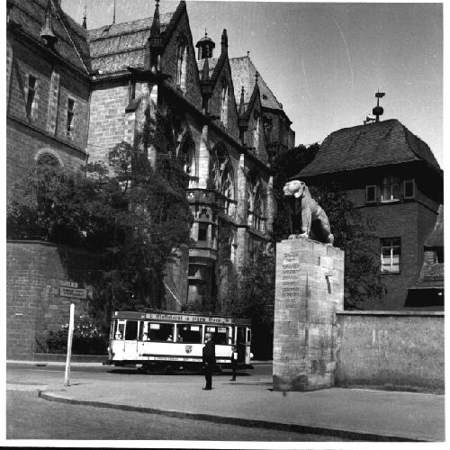 Kurze Chronologie der Straßenbahn in Marburg 1893 - 1902: Ein Pferdeomnibus fährt vom Hauptbahnhof durch Pilgrimstein und Universitätsstraße bis zum Wilhelmsplatz. Dieser rotangestrichene Omnibus trug die Aufschrift: "Durch die Stadt, von und nach dem Bahnhof."